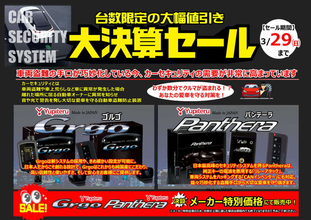 大決算!カーセキュリティ大特価セール【3月29日㈰まで】 2026.03.12 ただいま当店では大決算セールを開催中です! 車両盗難の手口が巧妙化している今、車上荒らしだけではなく わずか数分でクルマごと盗まれてしまう!? そこで注目されているのがカーセキュリティシステム 当店ではメーカー決算企画としてYupiteruの2大ブランド 『Grgo(ゴルゴ)』『Panthera(パンテーラ)』を 特別価格にてご提供しております! メーカー企画の超お買い得プライスは店頭にて