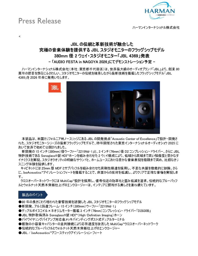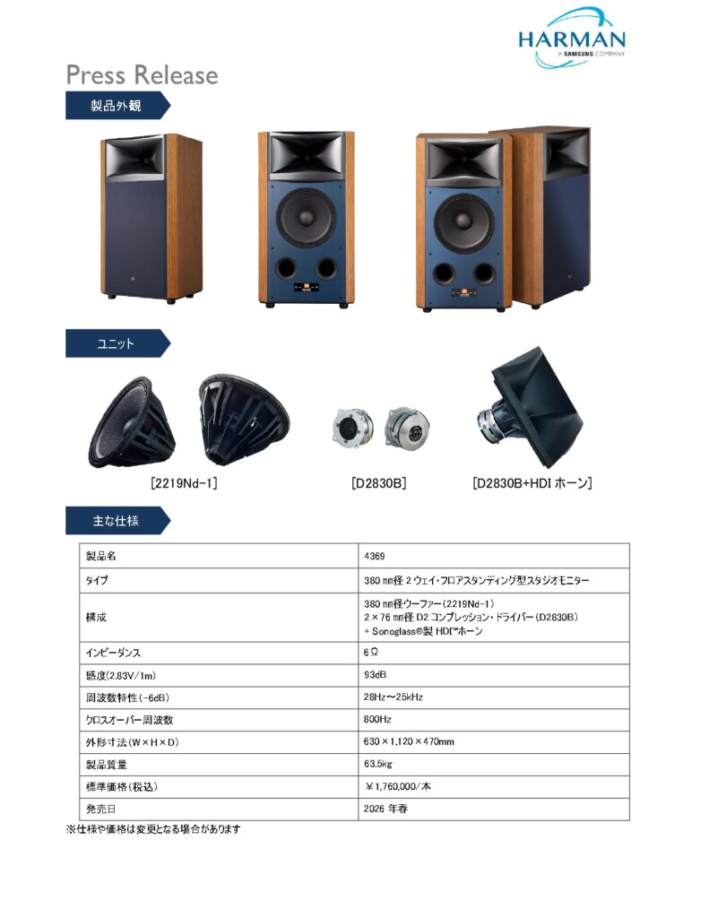 新製品情報:JBL スタジオモニターのフラッグシップモデル「JBL 4369」